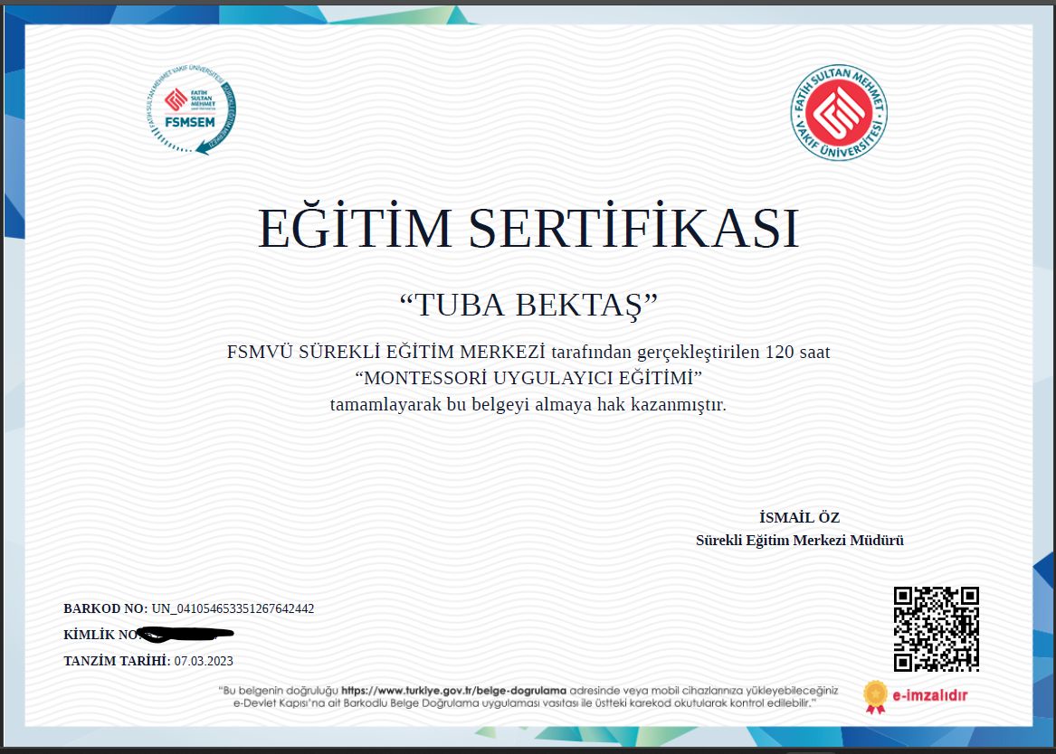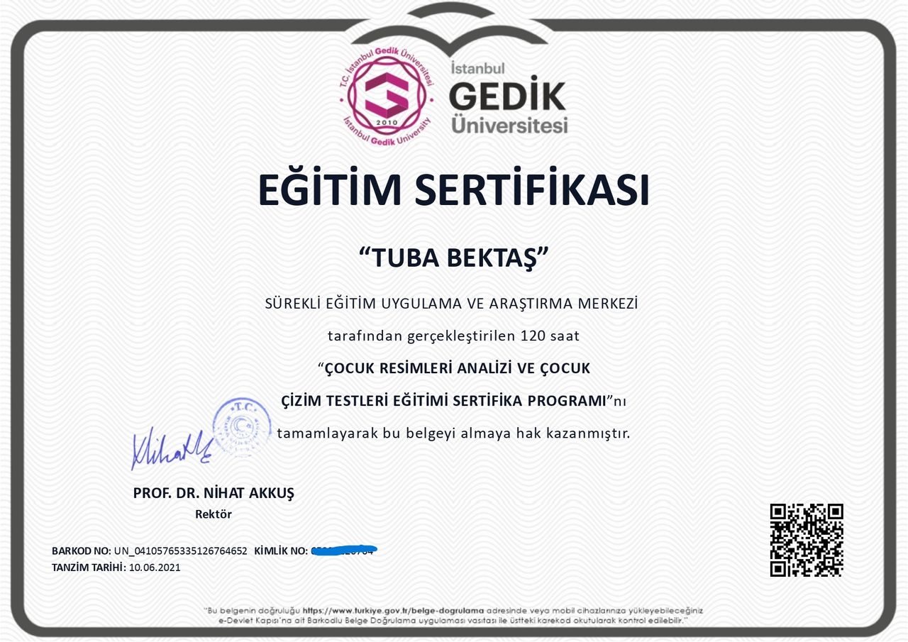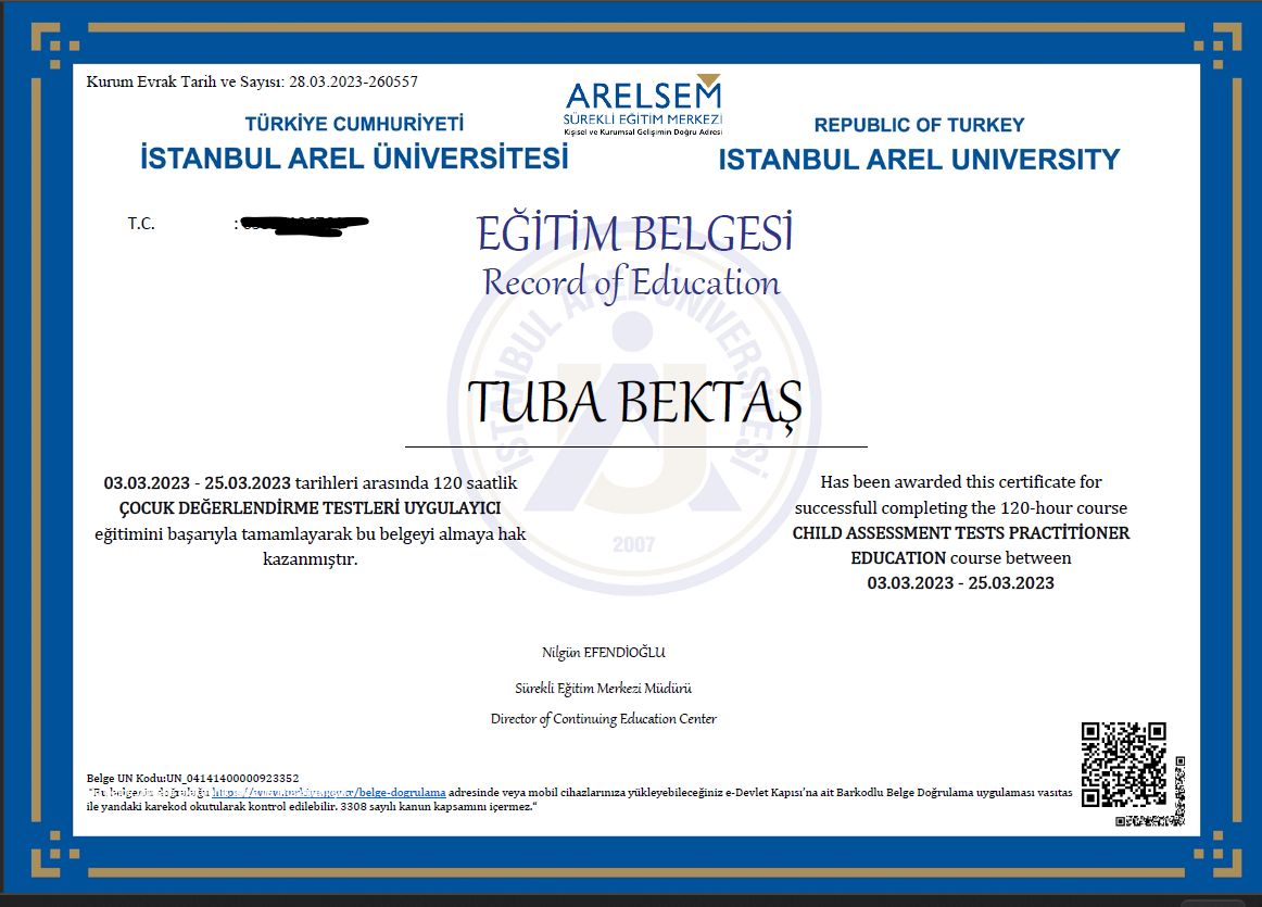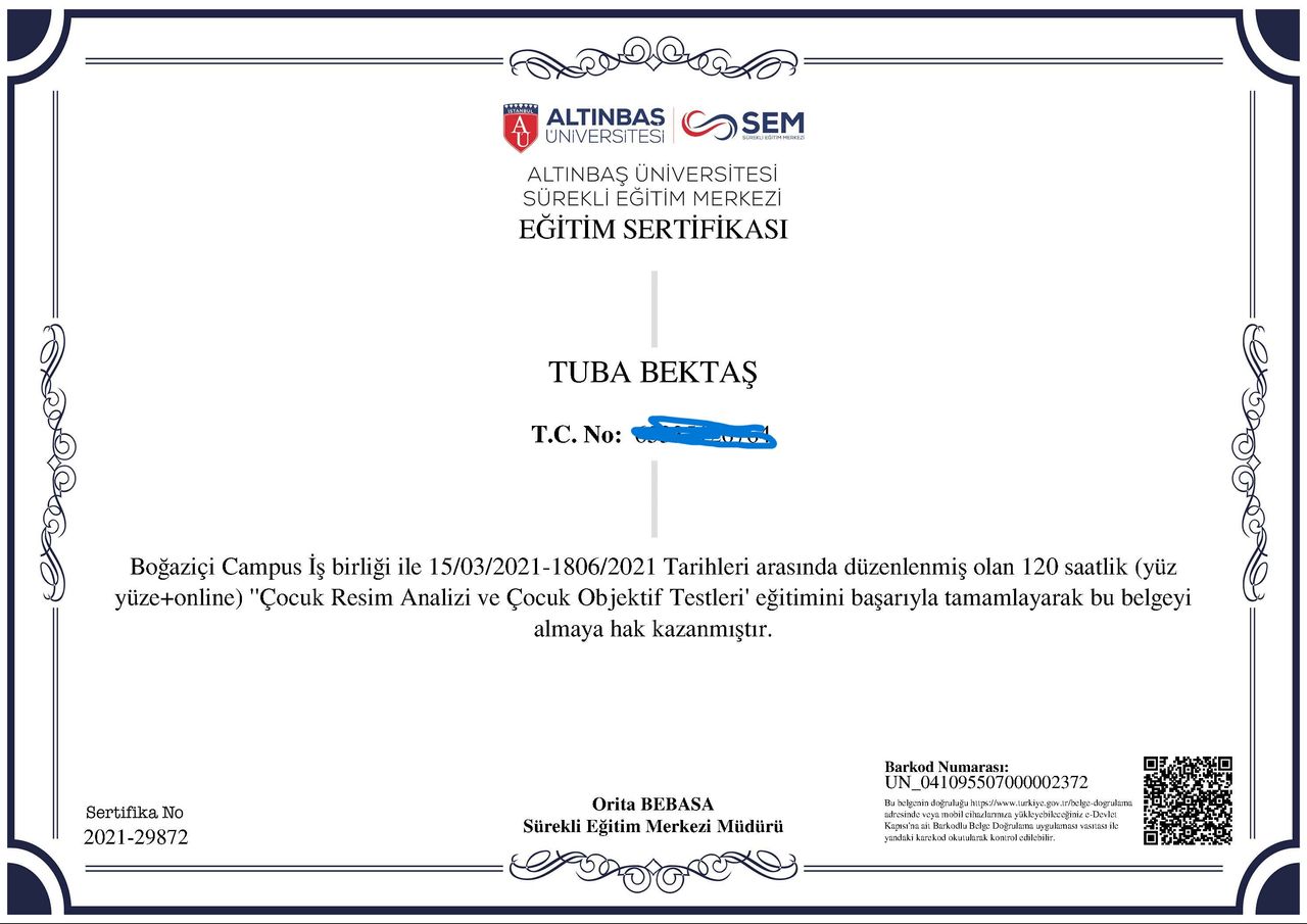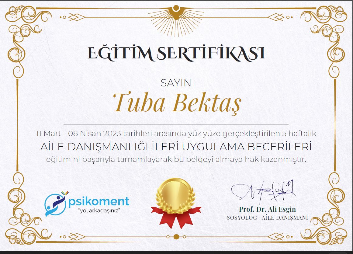 Çocuk Gelişimi Uzmanı ve Aile Danışmanı Tuba Bektaş, İstanbul Üniversitesi Çocuk Gelişimi Bölümü’nden mezun olduktan sonra İstanbul Aydın Üniversitesi Psikoloji Yüksek Lisans programını başarıyla tamamlamıştır. Eğitim hayatı boyunca ve sonrasında çocukların gelişim süreçlerini desteklemek, ailelere rehberlik etmek ve psikolojik danışmanlık alanında yetkinliğini artırmak için çok sayıda uzmanlık eğitimi almıştır.