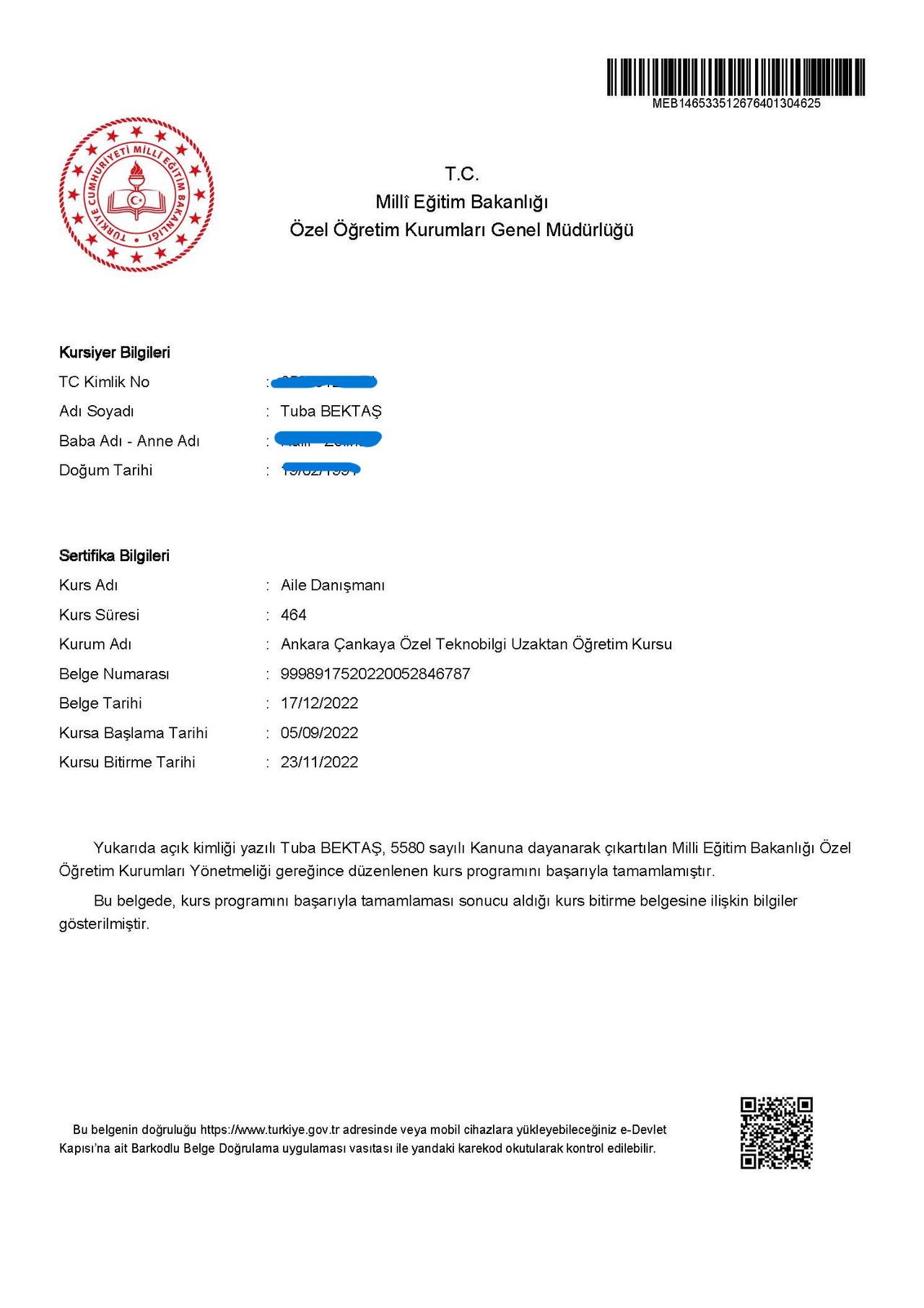 · Aile Danışmanlığı ve Uygulama Becerileri Eğitimi